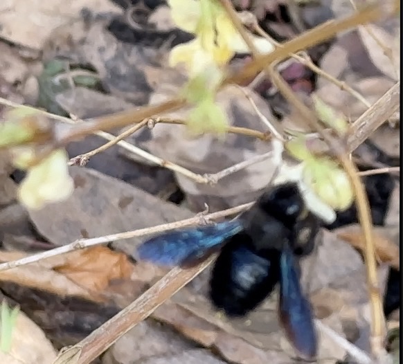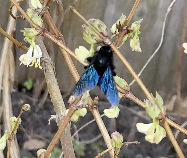 Herefter blev min opmærksomhed fanget af et meget stort, skinnende sort insekt der fløj hurtigt fra blomst til blomst, ingen humlebi i hvertfald, da jeg kom nærmere var der slet ingen tvivl.. for første gang så jeg tømrerbien (Xylocopa violacea) i min have, se nedenfor.